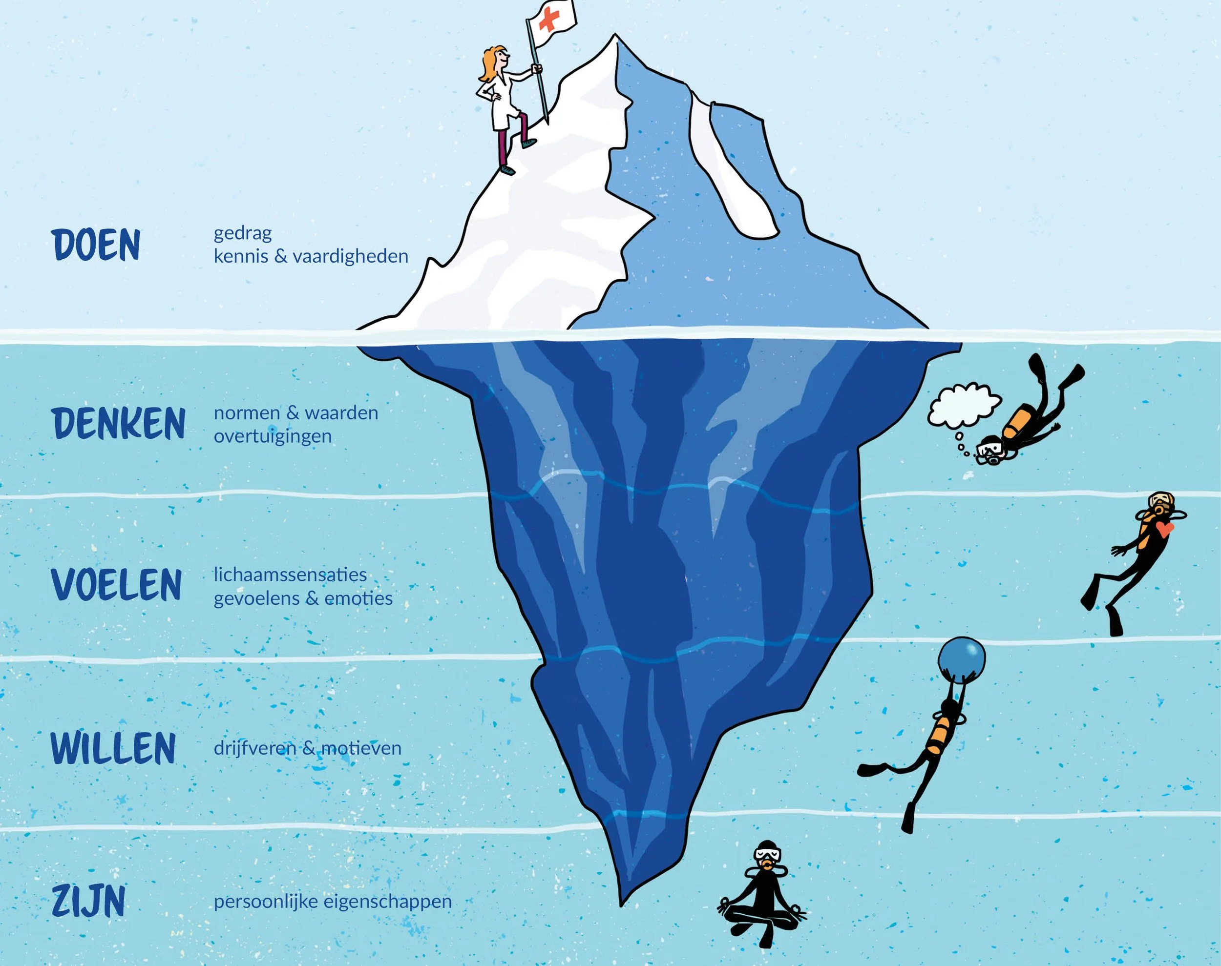 Eigenlijk zijn we allemaal ijsbergen. De Amerikaanse psycholoog David McClelland ontwikkelde deze metafoor, met boven de waterlijn de zichtbare aspecten van de mens: kennis, vaardigheden en gedrag. Onder de waterlijn zitten je normen en waarden, je overtuigingen, de manieren waarop je naar jezelf en naar de wereld kijkt. Weer een laag dieper kom je bij je persoonlijke eigenschappen en drijfveren terecht.